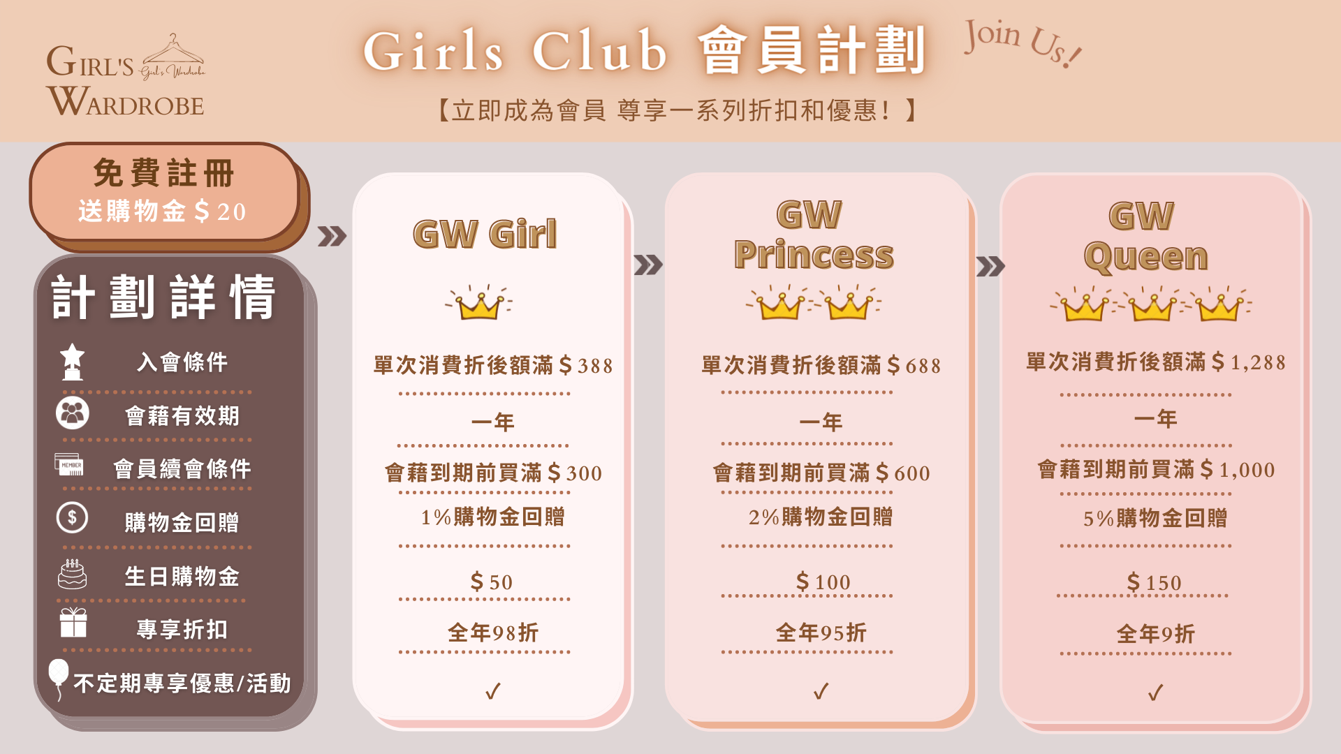 除了以上的會員優惠之外,Girl's Wardrobe 還會不定期推出會員獨家驚喜禮遇,如果不想錯過任何優惠活動,記得密切鎖定 Girl's Wardrobe Facebook/ Instagram,並立即加入成為 Girl's Wardrobe 會員及選擇接收會員資訊,才有機會在第一時間收到限時限量的驚喜和獨享優惠!