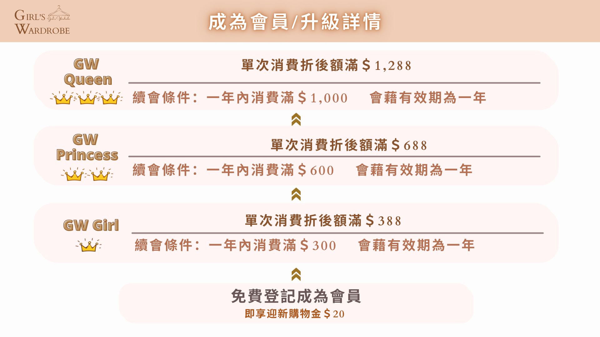 Girl's Wardrobe 將以「單次消費折後金額」決定你的會員等級,分別為: